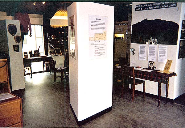 The Welcome Kiosk shown above is a three-sided free-standing structure that bears a greeting for visitors as they enter the Museum whether from the parking lot on the north side of the building or through the south-east door. The message is the same on each face and consists of a floor plan of the Museum with an indication of the contents of each section in broad terms. In addition it provides suggestions on how to view the exhibits including the introductory film in the theatre and the panel numbering scheme. It also calls attention to the Macpherson Heraldry section and special exhibits in the Drumochter Room as well as the Exhibits Guide, a floor plan of the Museum that the visitor may obtain at Panel 1 and carry with them as as a guide for viewing the subsequent exhibit panels. For a closer view of this panel Click here