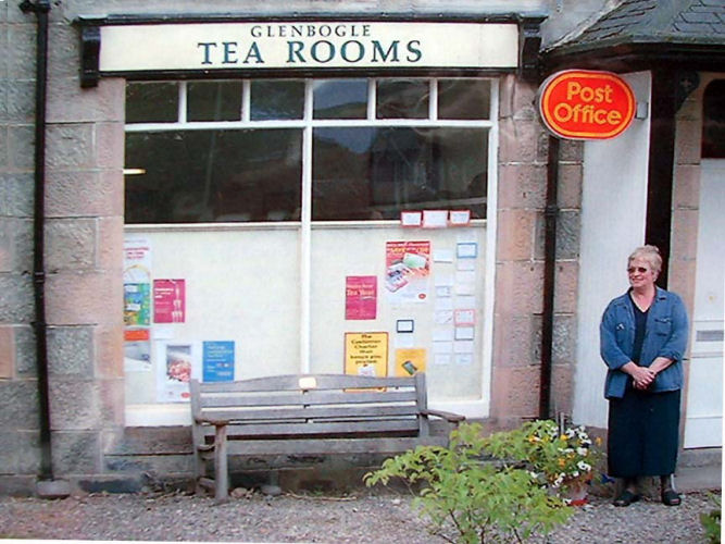 And before you visit the other displays you might be interested to know that the Museum's exterior was featured in several episodes of the BBC production 'Monarch of the Glen'. The photo shows the Curator of the time, Olive Ormiston (2001-2005) standing before it in its TV garb as the Glenbogle Post Office and Tea Rooms.